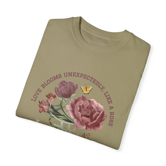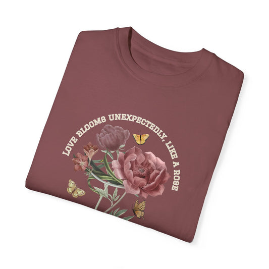 Comfy Love Blooms Unexpectedly Like A Rose T-shirt with White Lettering
