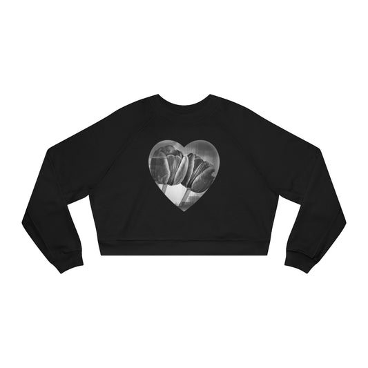 Vintage Style Black Cropped Fleece Sweatshirt with Monochrome Tulips