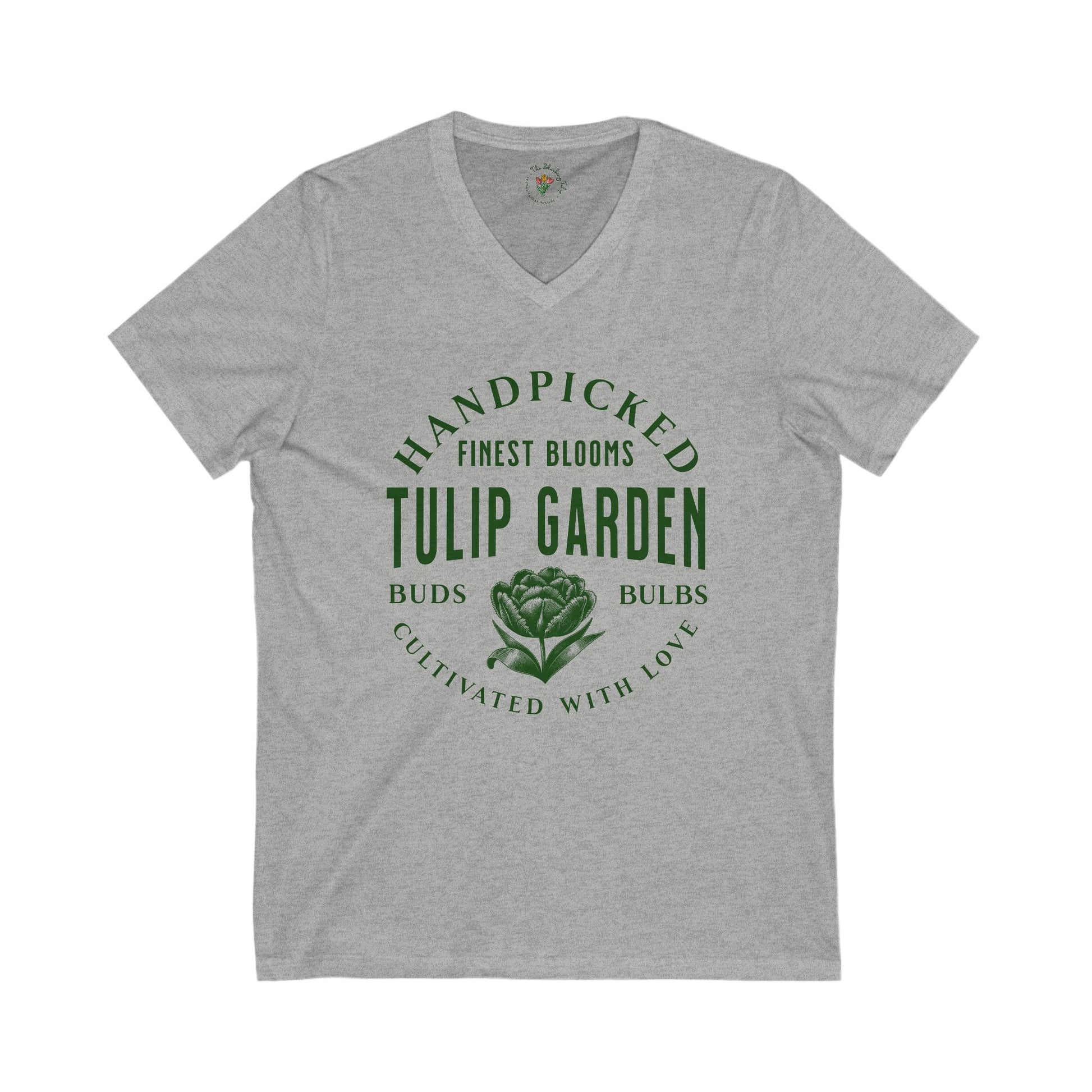 Inspired by classic botanical emblems, this custom women’s v-neck tee features a beautifully detailed fringed tulip at its heart, framed by vintage-style typography that reads “Handpicked Tulip Garden – Finest Blooms, Buds, Bulbs – Cultivated with Care.” Designed in a clean, circular layout, it evokes the quiet charm of curated gardens and the timeless beauty of nature’s most graceful bloom. Soft, elegant, and effortlessly wearable - this tee brings a little joy from the garden into everyday life.